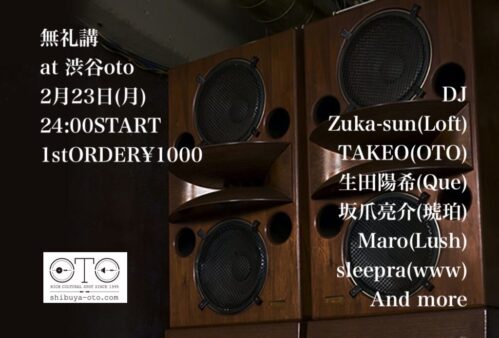 DJ Zuka-sun(Loft) TAKEO(OTO) 生田陽希(Que) 坂爪亮介(琥珀) Maro(Lush) sleepra(www) And more
