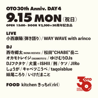 LIVE 小西康陽(弾き語り) WAY WAVE with arinco DJ(順不同) 西寺郷太(NONA REEVES) 松田”CHABE”岳二 オカモトレイジ(OKAMOTO’S) ゆけむりDJs DJフクタケ 犬重+ISHII 刑 ケソ JIRo しょうが キャベツこうべ taqoisblue 妹尾ころり いけだまこと FOOD kitch…