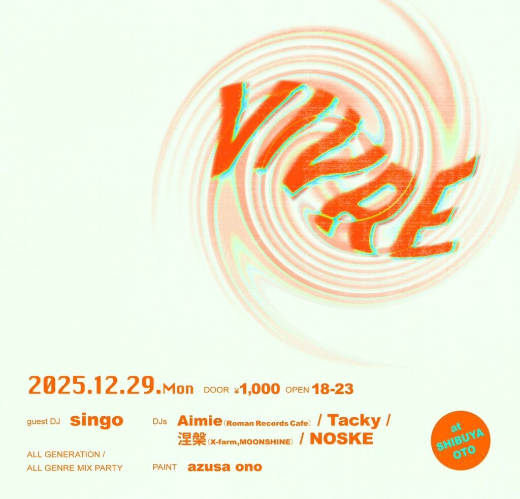 VIVRE vol.22??? 2025.12.29 Mon 18:00 〜 ¥1,000(+1drink) Guest DJ singo DJ Aimie(Roman Records Cafe)Tacky涅槃(x-farm,MOONSHINE)noske Paint azusa ono