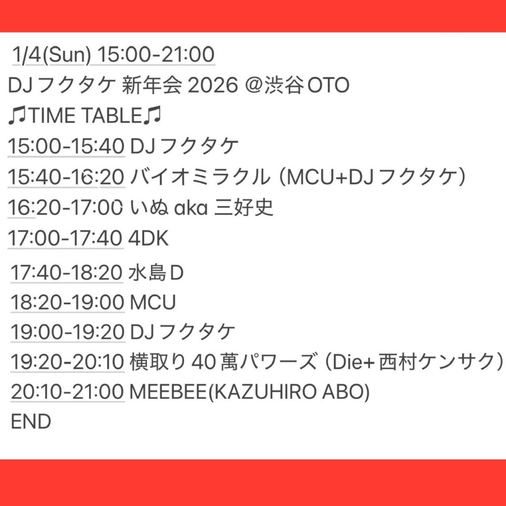 渋谷OTO 年始第1弾! DJフクタケ 新年会 2026 by 80steps & FRIENDS 2026.01.04 Sun 15:00 〜 ¥2000+1drink order DJs MCU 横取り40萬パワーズ(Die+西村ケンサク) 4DK バイオミラクルDJフクタケ水島DMEEBEE(KAZUHIRO ABO)いぬ aka 三好史(ex.The JG’s) Food manico mania