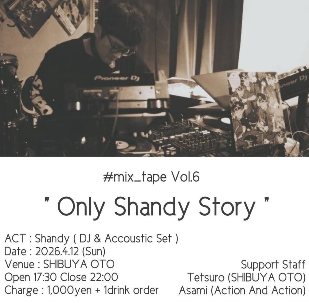 Only Sandy Story 2026.04.12 Sun 17:30 〜 ¥1000(+1drink) act Shandy(Dj & Accoustic Set) Supprt Staff Tetsuro(SHIBUYA OTO)Asami(Action And Action )