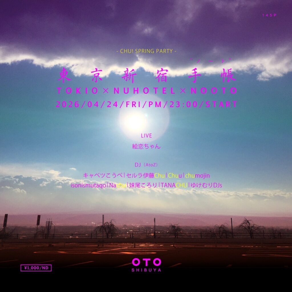 東京新宿手帳 -Chu! SPRING PARTY- 2026.04.24 Fri 23:00 〜 ¥1000(+1drink) LIVE 絵恋ちゃん DJ・CHUの人 TANACHUChuuchumojinNachu DJ・いつものみなさん キャベツこうべセルラ伊藤Chuisonismutaqo妹尾ころりゆけむりDJs