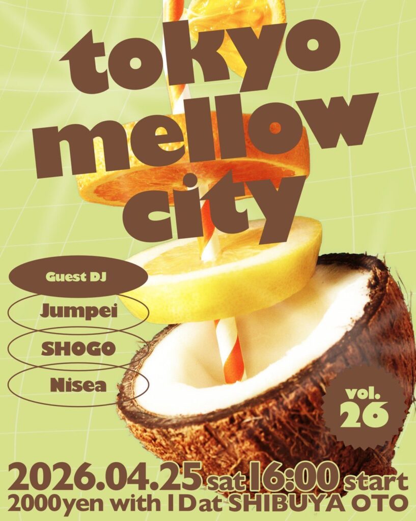 tokyo mellow city vol.26 2026.04.25 Sat 16:00 〜 ¥2,000 with 1drink Guest DJ JumpeiSHOGONisea tokyo mellow city crew muramuraskiemomarilynHasshyryo_oxxisxiharuna Flyer design haruna