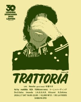 LIVE Neeche guest vocal 中津マオ GUEST DJ Ke1ty makillda NZA YUNA(WAY WAVE) トーニャハーディング trattorìa crew De ♨︎ Salsa imoeda J.A.G.U.A.R. Kitsuné K.Oshima FOOD DE LA FOODS